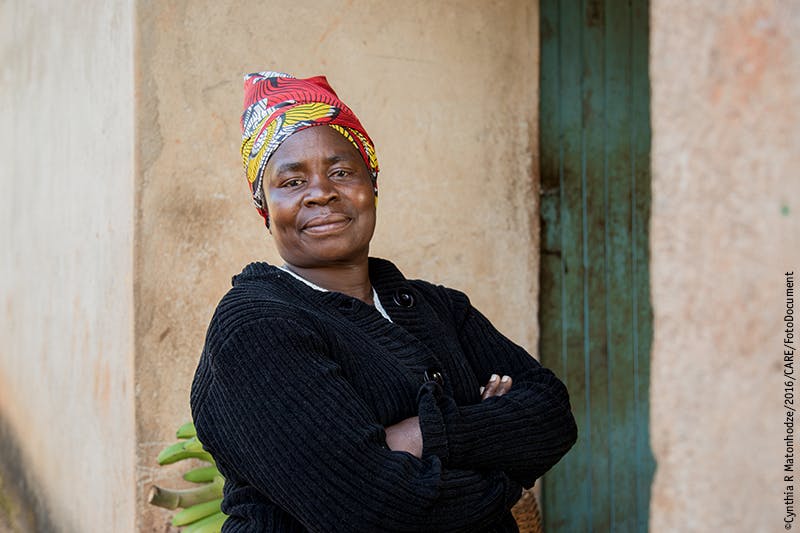 Lucia Mudima, a widow with four children, buys produce from small holder farmers in her community, ripens it, and sells it from her market stall in Harare.